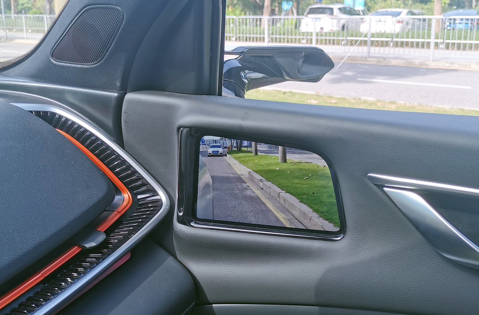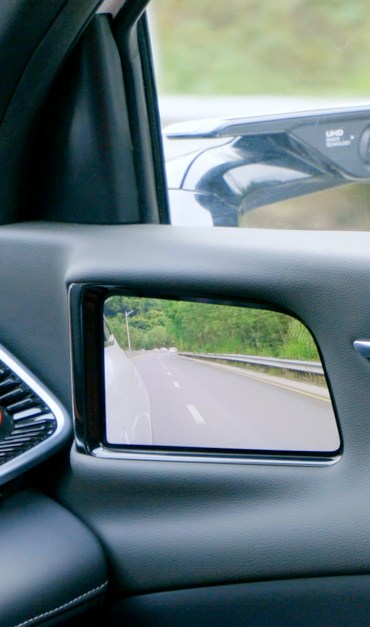 車規(guī)級OLED柔性屏貼合A柱設(shè)計,通過算法實現(xiàn)A柱“透明化、可視化”,不影響造型美觀與A柱強(qiáng)度情況下,完美解決A柱盲區(qū)問題。